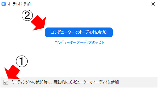 ②「コンピューターでオーディオに参加」をクリックする